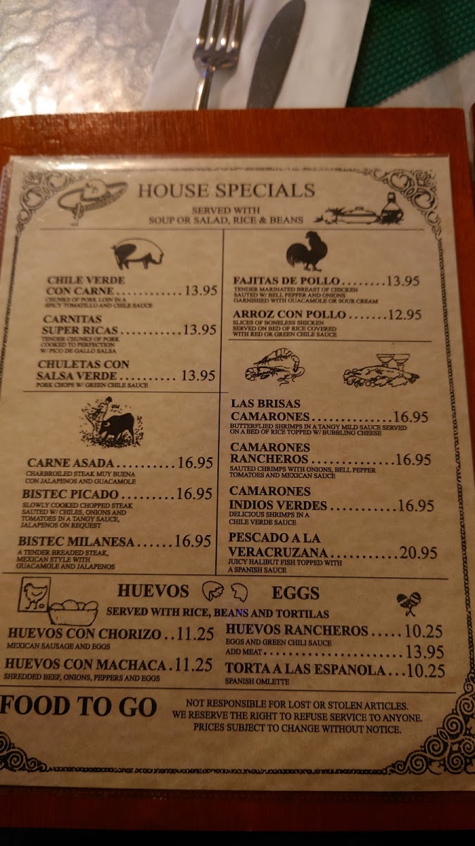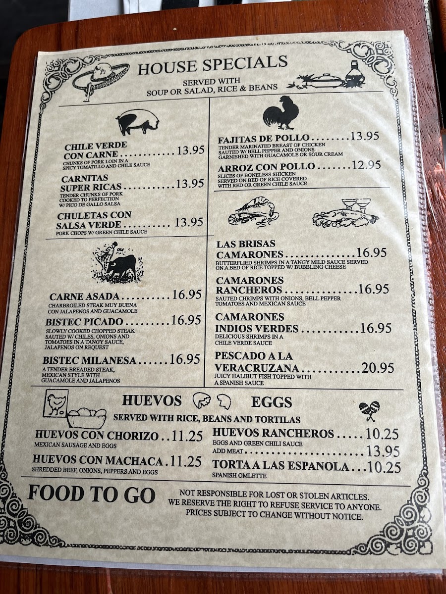Las Brisas Restaurant offers a straightforward and comforting menu that feels like a genuine taste of traditional Mexican home cooking. This is not a place for elaborate or overly complex dishes, but rather a cozy spot where you can enjoy satisfying meals that suit any time of day—whether it's a hearty breakfast featuring dishes like Huevos Rancheros or a relaxed dinner with house specials such as Carnitas or Carne Asada.